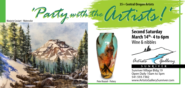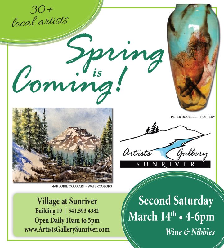 The Artists’ Gallery is in Building 19 in the Sunriver Village, between El Caporal and Campfire Cucina.