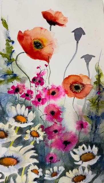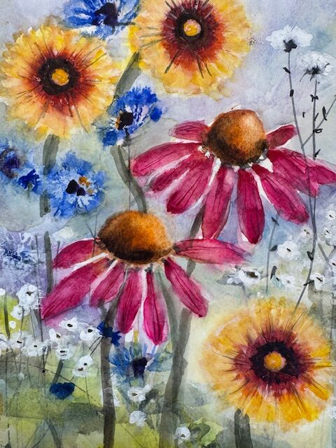 Cossairt’s watercolor technique takes full advantage of the fluidity of the medium, but spontaneity and control are the essence of each painting. Her approach is mostly intuitive, working in what appears to be a carefree manner creating shapes and textures, but resulting in representations of reality. Viewers really must see her work to understand just how difficult it is to accomplish this painting technique.