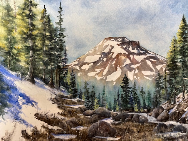 After viewing the work of painter Majorie Cossairt, it is difficult to believe that she has not been painting all her life. The artist only took her first watercolor class after moving to Central Oregon in 2006. Many of the beautiful landscapes that Cossairt paints are viewed from her twenty acres of open meadowland while caring for her four horses.
